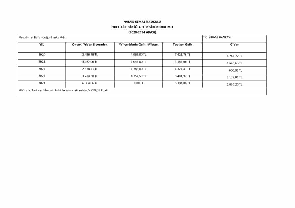 2025 yılı Ocak ayı itibariyle okulumuza ait Okul Aile Birliği Gelir Gider Tablosu aşağıda kamuoyuna sunulmuştur.